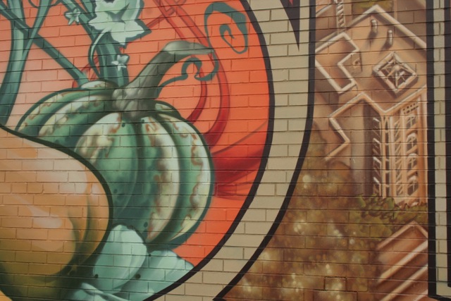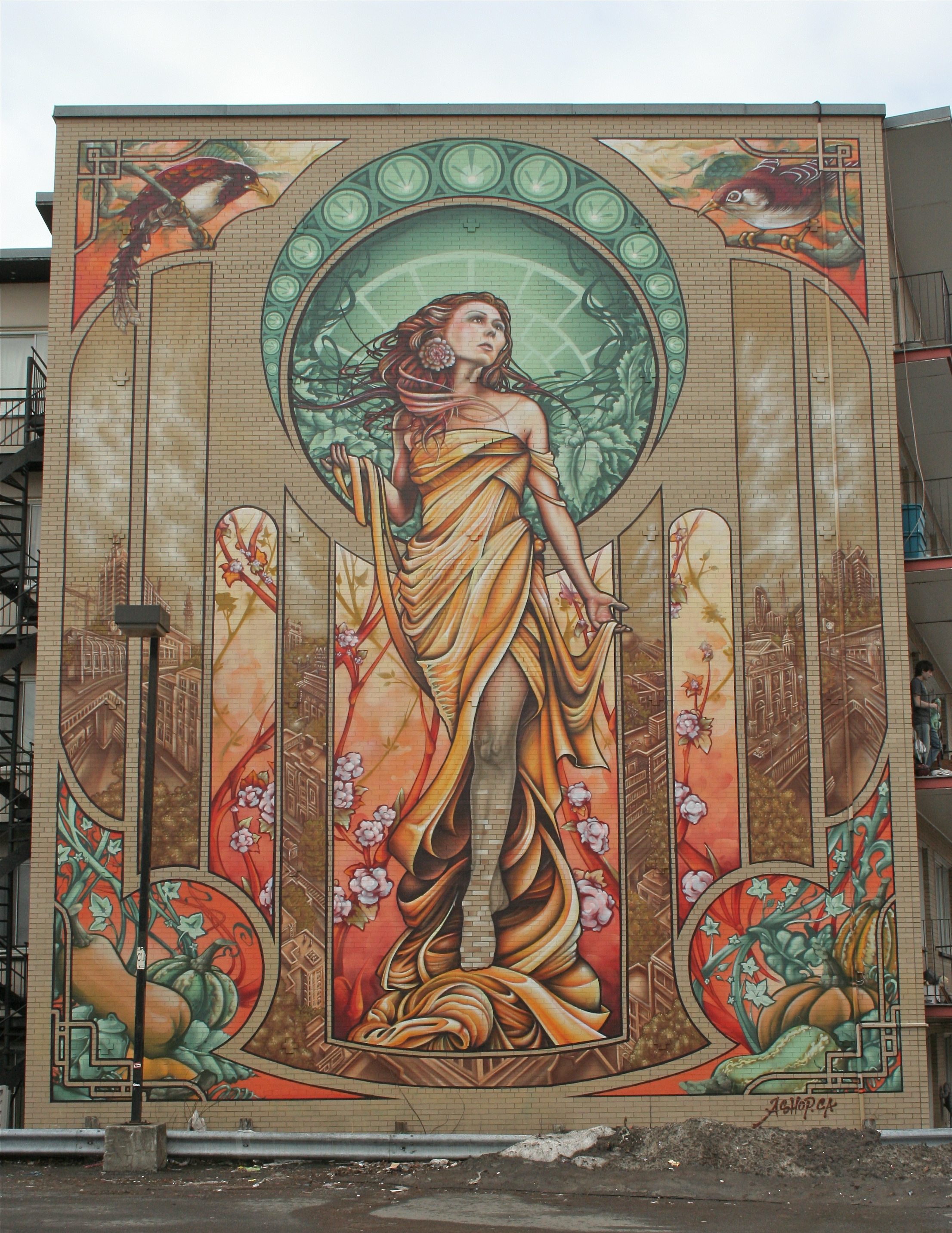 The birds and produce in this mural are consistent with the art nouveau interest in the natural world – and the artists have tried to create a greater link to NDG by way of the apartment buildings (with skylights) that are imbedded in the mural. (The farm produce also fits the history of the neighbourhood, since this whole area was farmland not too long ago.) The artists have also attempted to make a link with the neighbourhood by giving the mural the name “Our lady of grace” – which, of course, is the meaning of Notre-dame-de-Grâce.
