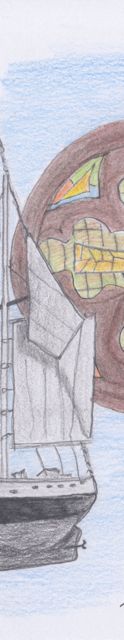 The most recent drawing I did was one that I drew specifically for her, and gave to her at the service she hosted at the Jewish General. It is a simple image of a ship hanging in a church, a sight not uncommon in Danish Lutheran churches, and in some others also. (Some years back my friend Phil Irish did a series of oil paintings of such ships hanging in churches.) The ships are hung there as a reminder of God’s care for those who travel on the sea – and as a reminder of the people’s prayers for those who face the risk and challenge of the sea. And the ships are also hung there, I think, as a reminder that we are all, at times, travelling through difficult seas.