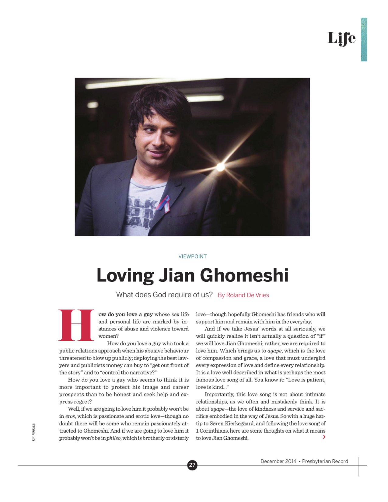Well, if we are going to love him it probably won’t be in eros, which is passionate and erotic love – though no doubt there will be some who remain passionately attracted to Ghomeshi. And if we are going to love him it probably won’t be in phileo, which is brotherly or sisterly love – though hopefully Ghomeshi has friends who will support him and remain with him in the everyday.